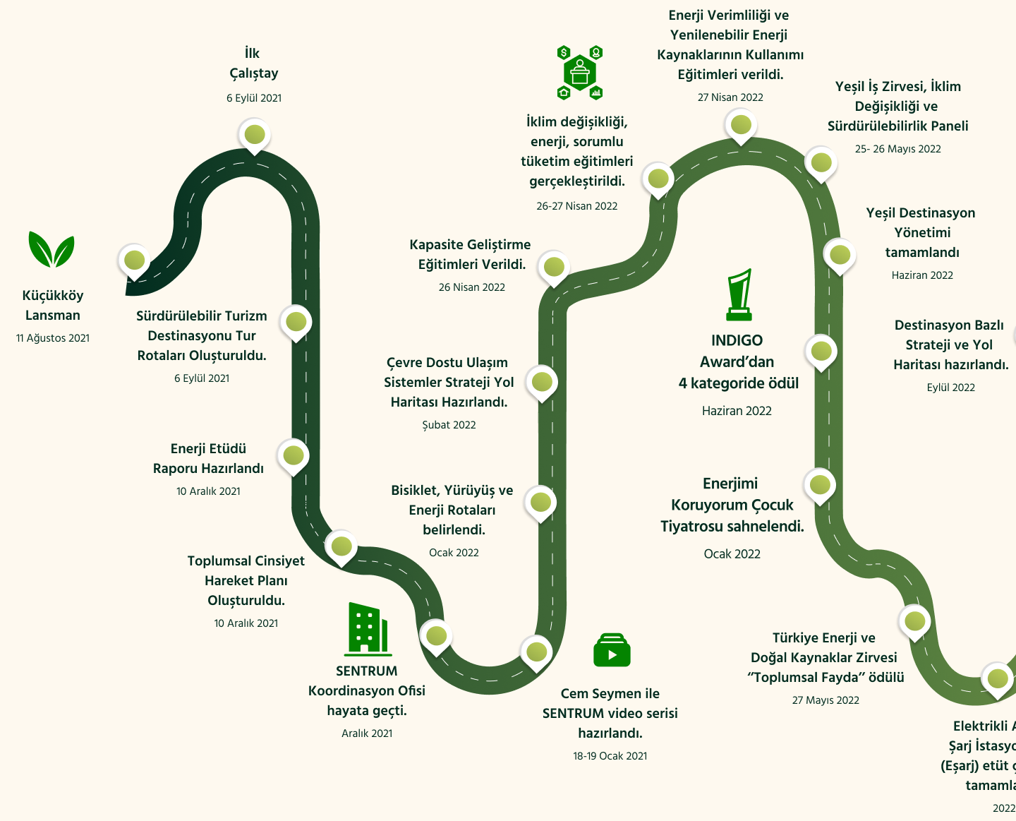 Küçükköy yeşil destinasyon olma yolunda da önemli adımlar atmıştır. Kültürel ve doğal değerlerin korunduğu, enerji verimliliğinin sağlandığı, yenilenebilir enerji uygulamalarının olduğu, atıklarını ayrıştıran, turizmi 4 mevsime yayılmış, teknoloji ve sanatı buluşturan ve bölge halkının refahının arttığı bir destinasyon oluşturulması amacıyla Enerjisa Enerji, Birleşmiş Milletler Kalkınma Programı (UNDP) ve Sabancı Üniversitesi iş birliğinde SENTRUM- Yeşil Destinasyon Modeli projesi ilk defa Küçükköy’de hayata geçmiştir.
